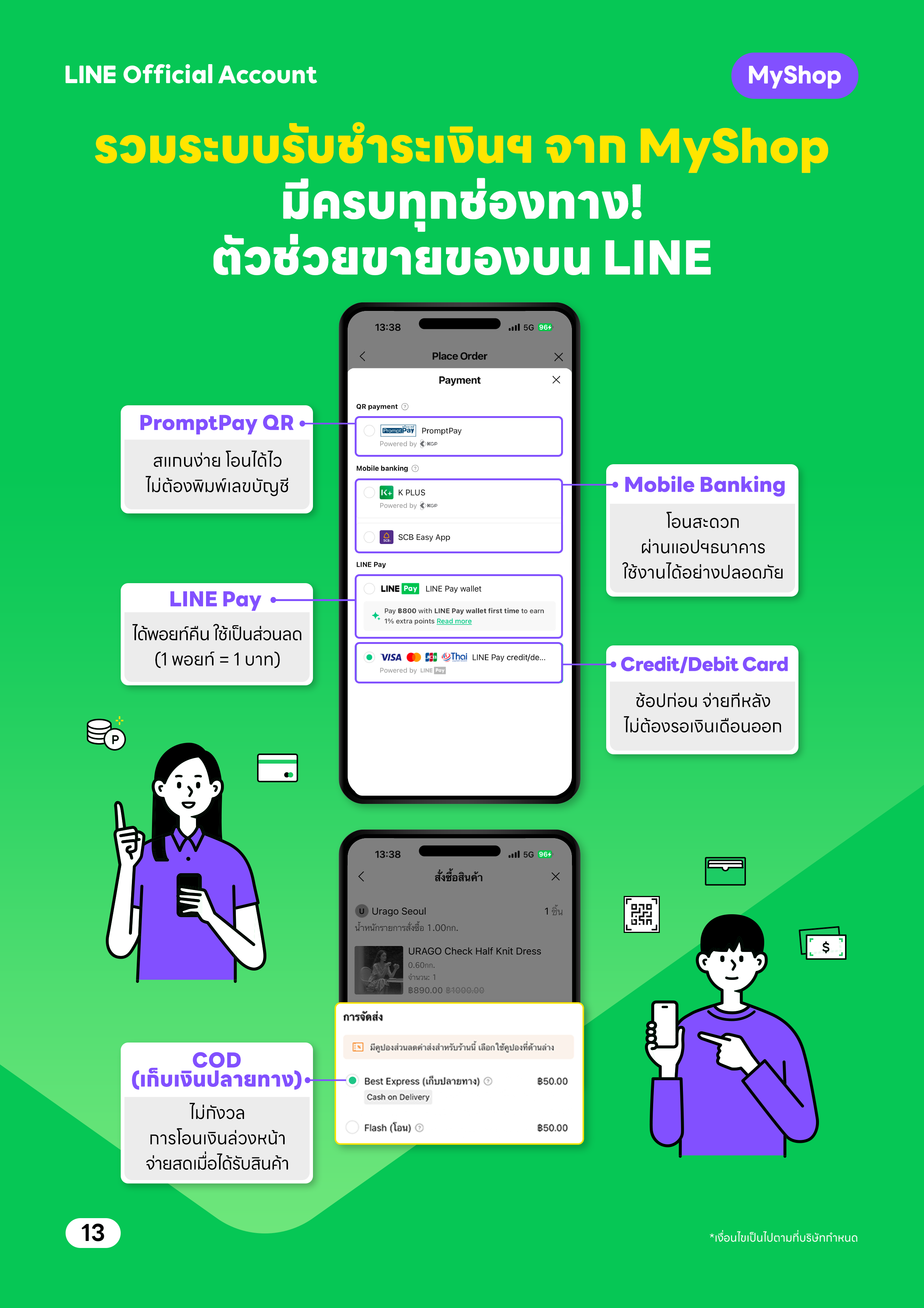 - ช่องทางการชําระเงินหลากหลายรูปแบบ ได้แก่ PromptPay QR, Mobile Banking (K PLUS / SCB), LINE Pay (e-Wallet / Credit,Debit Card) และ COD (เก็บเงินปลายทาง) ตอบโจทย์ทุกรูปแบบการช้อป